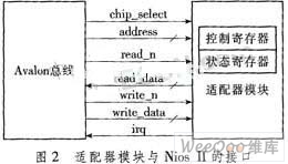 适配器模块作为自定义组件通过Avalon总线挂接在Nios II系统中,它与Nios II的接口如图2所示。
