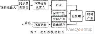 实现框图见图3,输入的MPEG-2 TS流先要同步,找到TS流的包头,去掉空包后输入FIFO。包复用模块按照时钟产生模块输出数据,同时插入MIP包。当FIFO中数据不足时,则插入空包模块产生的空包。由于码流重组和速率适配,导致各包在适配器中停留时间不一致,因此要进行PCR校正。本文PCR校正采用置入法,即在输入码流中检测到 PCR包后,将包中的PCR值减去系统27MHz时钟当前的计数值;当输出缓存中检测到PCR包后,将包中已改过的PCR值加上系统27 MHz时钟当前的计数值,这样,用一套计数器就可完成PCR校正和更新。
