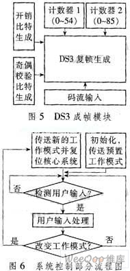 为使中转站通过SDH网络接收码流,DTMB单频网适配器增加了DS3输出接口。DS3是由复帧构成的,一个复帧分为7个子帧,1个子帧分成8块具有85 bit的比特块,每块的第一个比特是开销比特,其他84 bit用于传送净荷。所以一个复帧有56个开销比特。包复用模块产生的码流是MPEG-2的TS流,因此需要一个DS3成帧模块以实现到SDH网络的适配。DS3成帧模块的实现框图如图5所示。在一个复帧的开销比特中,除奇偶校验比特外,其他开销比特在特定的网络环境中一般都是固定的,所以单独计算奇偶校验比特。复帧内的各比特块以及各比特的确定主要靠2个计数器来实现,一个用来指示比特块,范围是0~55,一个用来指示比特块内的每个比特,范围是 0~84。通过这2个计数器可在适当位置插入开销比特和净荷数据,从而完成到SDH网络的适配。