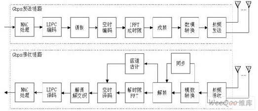 为满足未来移动通信标准的需要,在算法链路上Gbps系统采用时分双工(TDD)、多天线(MIMO)、空时编码、正交频分复用(OFDM)、高阶调制和LDPC编码等高性能物理层传输技术,以实现Gbps系统所需的高数据速率业务传输和高频谱效率。以频分、时分为主的多址方式实现,能够在多天线环境下对无线资源进行灵活调配,在兼顾实时话音传输的同时,最大程度上满足分组数据传输的需要。