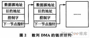 DMA数据传输可分为块传输和散列传输两种方式。在DMA传输数据的过程中,要求源物理地址和目标物理地址必须是连续的。但是在某些计算机体系中(如IA架构),连续的存储器地址在物理上不一定是连续的,所以DMA传输要分成多次完成。传输完一块物理上连续的数据后引发一次中断,然后进行下一块物理上连续的数据传输,这就是DMA块传输方式(Block DMA)。散列传输是在块传输方式上发展起来的,它与一个传输链表相关,如图2所示。该链表可以是单向结构或环形结构。控制字中包含数据位宽、数据块大小、当前块传输结束是否引发中断等控制信息。DMA块传输可看作是只含有一个节点,且下一节点指针总是指向当前节点的散列传输。采用散列DMA方式能更灵活、高效地传输数据。