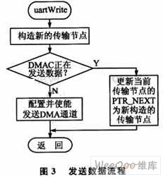 发送数据时,待发送的数据量总是已知的。先构造一个传输节点,数据源地址为数据包的首地址,目的地址为UART寄存器,数据位宽为8,下一节点指针(PTR_NEXT)为空。当前数据包发送结束前,如果PTR_NEXT被更新,则下一个数据包的传输自动开始。当前数据包是否发送完毕,可通过读取DMAC寄存器DMACCnControl的TransferSize字段得知。整个发送数据的过程无需触发任何中断,流程图如图3所示。如果采用DMA块传输方式,就需要在每次传输完毕后产生DMA中断,重新装载数据到内存中的发送数据区以发送下一个数据包。