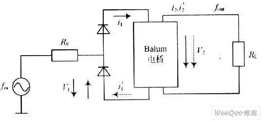本文也采用平衡倍频电路,两只同样的二极管相对于输入和输出信号分别以反向并联和串联形式接入,原理如图2所示。