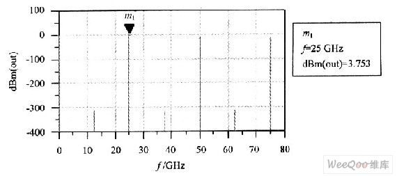 为了提高二极管的一致性以及便于安装,选用T字型封装的梁式引线二极管对,安装在背面CPW和槽线连接处。将整个结构在ADS中进行仿真、优化,结果如图4所示(其中横轴表示输出信号对应的频率,单位:GHz;纵轴表示输出信号的功率,单位:dBm)。
