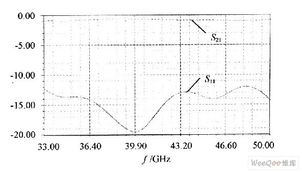图6中上面一条曲线表示探针过渡结构的S21(dB),下面一条曲线表示探针过渡结构的S11(dB),横轴表示仿真频率33~50 GHz。得到实物后,再根据测试结果做一定调试,就能得到比较满意的结果。