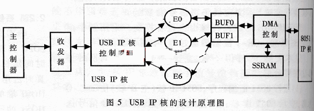 USB IP核的设计原理图如图5所示。USGB主控制器为USB主机端(通常安装在计算机内),负责主机与USB设备间的物理数据传输,即将客房软件启动的数据传输转化为USB总线上的实际串行数据流,经USB传输线传输。收发器将收到的数据转换成数字CMOS串行数据流,然后通过USB核控制逻辑传输到设备端点(图中的E0~E6),最后通过DMA接口传送到8051 IP核或存储在SSRAM中。