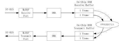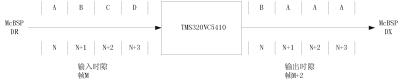 在第M+2帧时发送DMA控制器从它的数据缓冲区内依次读出相应的数据送给McBSP的发送端口,发送端口首先将此线性码语音数据转成A律语音数据,然后完成PCM话音数据发送。