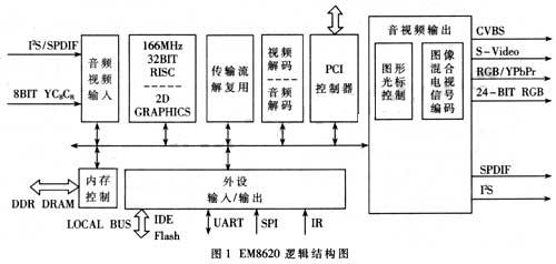 设计方案中采用一个低成本但功能相对丰富的集成芯片--EM8620作为硬件平台,它是Sigma Designs公司专门针对数字视频通信设计的最新一款多格式解码芯片、内嵌166MHz的32位RSIC处理器,具有丰富的音视频接口,此外还包括PCI总线控制器和IDE总线接口,依托二者能够实现网络接入、USB外设和IDE外设(如硬盘、光驱)访问等功能。图1是该芯片的逻辑单元框图,其主要功能和特点包括: