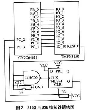 为提高增加接口卡的可靠性及稳定性,本设计增加了一个锁存器,完成复位接口的功能。当3150芯片复位时,通过锁存器将复位信号传送给CY7C68013内置的8051处理器,8051接到复位信号自动复位,并马上清锁存器,其接线如图2所示。在并口通信中,8051与3150同步非常重要,要完成并口通信,8051首先要与3150达到同步且同步操作必须在3150复位时进行。8051只在初始化程序时才与3150进行同步操作。因此完成同步后,每当3l50由于误操作或错误运行而造成复位时,3150与8051将会失去同步,而8051无法检测到,从而造成并口通信失败。加入锁存器之后,8051就能检测到3150的复位信号并自动复位自己的程序,使得8051与3150再次达到同步。这将使适配器的可靠性和稳定性都得到加强。