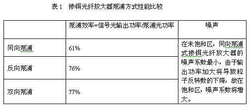 掺铒光纤放大器主要由掺铒光纤、泵浦光源、耦合器、光隔离器等组成。有同(前)向泵浦、反(后)向泵浦和双向泵浦3种泵浦方式,其区别在于信号光与泵浦光的注入方向不同。同向泵浦也称为前向泵浦,它的信号光与泵浦光以同一方向从掺铒光纤的输入端注入。反向泵浦也称为后向泵浦,它的信号光与泵浦光以两个不同方向注入进掺铒光纤。双向泵浦就是同向泵浦与反向泵浦合并的方式。三种泵浦方式的结构图如图1所示。三种泵浦方式的性能比较见表1。
