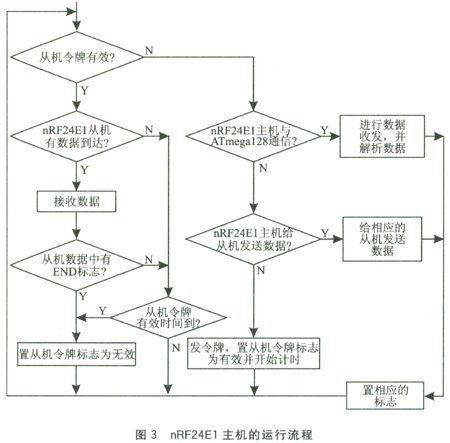 图3所示为。nRF24E1主机在正常情况下的运行流程。主机在令牌发出去以后,就只能处于无线接收的状态,直到从机的令牌无效后才能进行与ATmegal28的通信或者给从机发送数据。