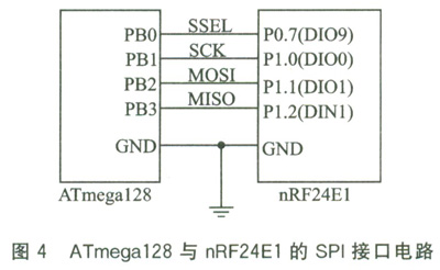 图4为ATmegal28与nRF24E1的SPI接口电路图。nRF24E1为SPI的主机,ATmegal28为从机。通过SPI接口可使nRF24El与ATmegal28的最大通信速率达到2 Mbps,因此,传输的速度可以满足大多数场合的应用。