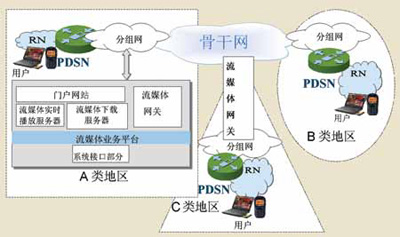 单点系统的组网结构存在两个不同类型的地区,位于A类地区用户相当于本地用户,用户接入后可以通过本地的分组网直接接入到本地的流媒体业务平台使用流媒体服务;B类地区的用户在接入本地的分组网后还需要通过骨干网连接到远端的流媒体业务平台。