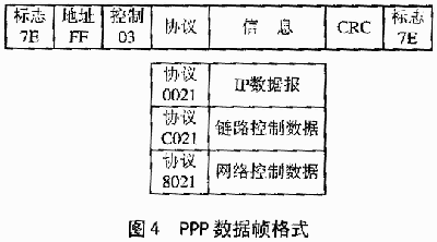 PPP(Point to Point Protocal,点对点协议)修改了SLIP协议中的缺陷。PPP中包含3个部分:在串行链路上封装IP数据报的方法;建立、配置及测试数据链路的链路控制协议(LCP);不同网络层协议的网络控制协议(NCP)。PPP相对于SLIP来说具有很多优势;支持循环冗余检测、支持通信双方进行IP地址动态协商、对TCP和IP报文进行压缩、认证协议支持(CHAP和PAP)等。图4为PPP数据帧的格式。