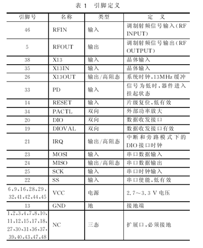 表1为CYWUSB6935芯片48QFN封装的引脚定义。
