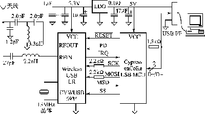 图2中,WirelessUSB LR桥最小系统包括Cypress公司enCoRe系列的低成本USB控制器,和由芯片CYWUSB6935组成的射频模块。其中USB控制器负责控制射频模块的工作状态及上位机与射频模块之间的数据通信,而射频模块主要由CYWUSB6935完成数据的无线传输和通信协议的解读工作。整个系统采用总线供电方式,通过USB总线可以得到5 V的电压,供USB控制器使用;经过低压线性稳压器(LDO),CYWUSB6935可以得到需要的3.3 V电压,因此系统无需外接电源,从而提高了适用性和便携能力。