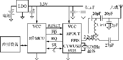 如图3所示,WIrel essUSB LR HID最小系统主要由一个8位微控制器(MCU)和CYWUSB6935芯片组成。微控制器主要负责外设与射频模块的数据传输,同时也可以兼顾简单应用设备(如数据采集板和LED显示屏)的控制工作。整个系统多采用电池供电方式。为了提高电池的续航能力,在没有数据传输时,射频模块会被设置工作在休眠模式下,等待数据到来后被唤醒。