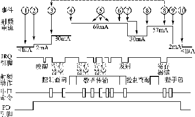 以下是WirelessUSB LR 2Way系统中,桥接器(bridge)从人机接口设备(HID)节点上接收数据的典型过程,其间的时序和电流变化如图5所示。