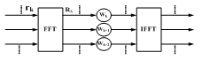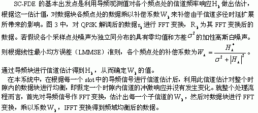 对于一帧而言,主要包括长度为256个chip的主同步码(PSC,完成同步功能)以及数个Slot。根据PSC完成同步后,截取出各个传输块,并根据导频块对各个数据块所处处的信道进行估计。具体而言,SC-FDE关键算法由图3所示。其中 为接收到的传输块, 为其变换到频域后的结果。