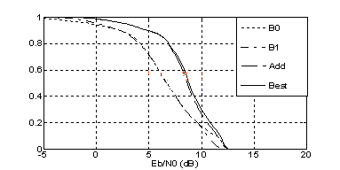 图4为解调输出信号Eb/N0的CDF曲线,其横坐标为解调输出信号的Eb/N0(单位:dB)。 曲线为天线0的输出信号Eb/N0的CDF曲线, 曲线为天线1的输出信号Eb/N0的CDF曲线, 为两个天线解调输出信号相加后所得结果的Eb/N0的CDF曲线, 曲线为从上述三个结果中适时选择最好的一个所对应的Eb/N0的CDF曲线,从图中可以看出,采用分集技术可以明显提高系统的稳定性和可靠性,大大提高系统的覆盖范围,而且采用分集方式时,直接合并与从三个结果中选择最好的一个的效果基本一样。