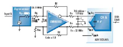 以下是单端/差分信号放大器的技术规格:若增益为 1.8 倍,带宽便要高达 80MHz 以上;输入噪音不可超过 8 nV/?Hz;以及失真必须受到 70dB 以上的抑制。美国国家半导体的全新 LMH6550 差分高速运算放大器完全符合以上的规定。这款放大器的增益带宽积达 400MHz,因此若增益为 1.8 倍,放大器的带宽可达 140MHz (400 MHz / (1 + 1.8))。LMH6550 芯片的输入电压噪音是 6 nV/?Hz,比规定的 8 nV/?Hz 更优胜,若以 20MHz 2 Vpp 的信号为例来说,这款放大器只有 70dB 的失真 (典型值),失真程度与模拟/ 数字转换器大致相同。