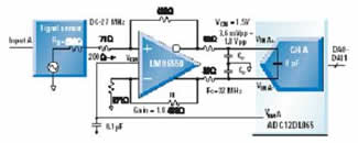 最后,放大器还需提供信号电平转移这个重要的功能,以便将信号电平调节至与模拟/数字转换器共模输入电压相若的水平。此外,共模电压的调节也很容易,我们只要利用 LMH6550 芯片,并将要求的共模电压 (亦即 ADC12DL065 的参考输出管脚的 1.5 伏电压) 输入放大器的 Vcm 输入端,便可调节共模电压。放大器输出共模电压最后会调节至 1.5 伏,与模拟/数字转换器的输入共模电压相若。