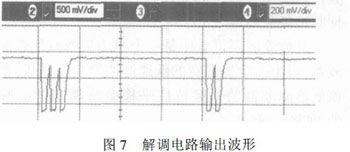 读写器发送1s脉宽的OOK调制信号。解调电路输出波形如图7所示。下脉冲上升时间较长是由于示波器探头引入的16pF电容所致。
