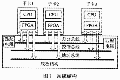 本通信系统由背板和若干通信子卡组成。背板并更有8个插槽,并布有BLVDS总线和其它控制、地址总线。通信子卡由EP7211芯片(负责数据处理)、XCV50E及DRAM、PROM等外围芯片和元件组成,系统结构如图1所示。
