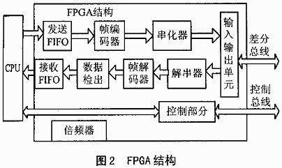 设计完成后的XCV50E由控制部分、发送FIFO、帧编码器、串化器、解串器、帧解码器、数据检出器、接收FIFO、时钟倍频器及输入输出单元等部分组成,结构如图2所示。