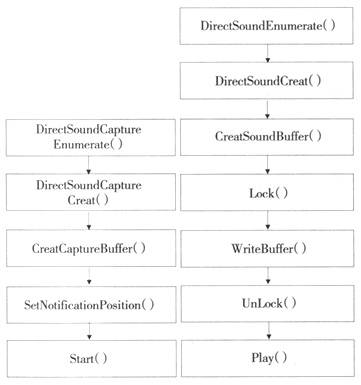 下面简要介绍一下实现DirectSound的步骤:DirectSound采集声音流程如图3所示,其中 DirectSoundCaptureEnumerate函数用来枚举系统中所有录音设备,DirectSoundCaptureCreat函数创建设备对象,然后通过CreatCaptureBuffer函数来创建一个录音的缓存对象,Se tNotificationPositon函数用于设置通知位,以便定期的从录音缓存中拷贝数据。DirectSound播放声音流程如图4所示,其中DirectSoundCapture、 DirectSoundCreat和CreatSoundBuffer函数也是做一些初始化的工作。Lock函数用于锁住缓存的位置。然后通过 WriteBuffer函数将音频数据写入缓冲区,写完后再通过UnLock函数解锁。
