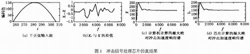 图3 为冲击信号处理芯片仿真结果之一。图3 中f 为单自由度系统的固有频率。图3 (a) 为峰值150 (8 位编码) ,持续时间0. 125 s ,以512 Hz/ s 采样的64 点半正弦输入波。图3 (c) 为计算机计算的最大绝对冲击加速度响应谱, X 为最大绝对加速度。图3 (d) 为本文设计的冲击信号处理芯片计算的最大绝对冲击加速度响应谱, Xs 为最大绝对加速度。图3 (b) 是Xs 与X 的差值。仿真结果符合文献对最大绝对冲击加速度响应谱的验证要求。