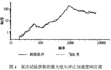 采用遥测系统速变通道和数据预处理器,同时获取冲击环境信息。具体试验方法为:遥测速变通道和数据预处理器,同时接收同一加速度计的输出信号,前者完成加速度计输出电压信号编码并将编码结果通过无线信道传输,后者完成对加速度计输出电压信号的编码、处理和分析,并将处理结果代替原始测量数据通过无线信道传输,将二者的测量结果进行比较。图4 为某次试验获取的最大绝对冲击加速度响应谱。