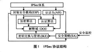 IPSec协议是因特网工程任务组(IETF)针对TCP/IP协议没有安全机制的严重缺陷而专门制定的IP安全标准,用以在IP层实现访问控制、无连接完整性、数据源验证、抗重播、数据加密和有限的业务流机密性等多种安全服务。该标准由一系列协议组成,各协议之间的关系如图1所示。