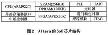 目前,SoC平台主要用于CSoC、SoPC、EPGA等芯片开发。其中,CSoC称为可配置系统级芯片,一般包括1个处理器内核、可编程逻辑阵列和其它一些通用部件;SoPC是可编程的单芯片系统,如Altera的Nios内核模块;EPGA是以FPGA为主体的SoC芯片。使用这些SoC开发平台,可以充分利用系统级芯片集成度高和性能优越的特点,灵活设计开发各种专用Soc芯片。