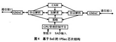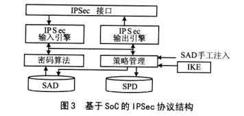以SoC实现IPSec的多协议模块包括:①IPSec协议输入、输出引擎,是通过协议解析,决定数据流程的处理;②安全关联、密钥交换、密码算法等,其中,安全关联模块为其直接提供所需参数,密钥交换模块用于IKE自动管理的SAD,算法模块是实现IP数据加解密和认证的基本模块;③接口模块,是 IPSec与IPV4/IPv6协议的接口界面。SoC中的CPU核,实施系统管理、策略管理和密钥管理等功能。