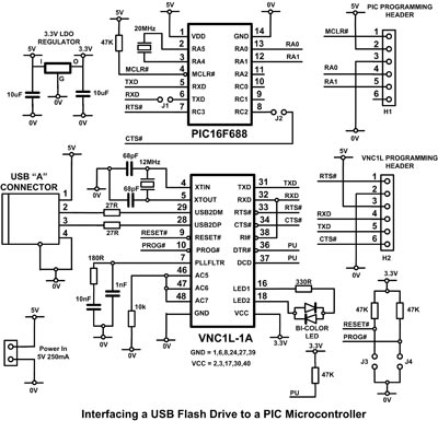 在PIC引脚2和3之间接入一个20MHz晶振可在其UART接口获得高达115200bit/s波特率,而使用内部8MHz振荡器只能获得最高9600bit/s波特率,因此加接晶振可提高系统性能。PIC的IO引脚RC2和RC3都被固件使用,以模拟与VNC1LUART连接的RTS/CTS握手信号。系统由PIC上的固件控制,数据传输则由PIC发出的指令控制,该指令由Vinculum上的标准固件进行解释。虽然说起来很简单,但完成设计还有其他一些工作要做,例如器件还需要电源、控制时钟的晶振以及编程。