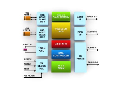 Vinculum专门针对嵌入式USB控制器市场,只需要很少外部支持元件。Vinculum核与常用MCU核相比的一个主要特点是其代码长度大幅缩短,减少内核在代码上的开销,因此可以在单芯片e-Flash存储器里装入更多功能,这一特点也正好可以弥补基于PIC的嵌入式系统的不足。系统原理图见图1,通过Vinculum将小型PICMCU连到USB“A”连接器上,然后就可以连接USB闪存盘了。
