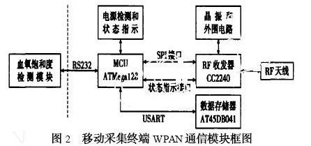 MCU部分是WPAN通信模块的核心,完成通信模块各组成部分的控制、协调和数据的加工。具体功能:通过RS232接口与血氧饱和度检测模块通信,实现对它的控制和配置,并接收检测数据;通过SPI接口和状态指示接口实现对RF收发器的配置和检测,并完成发射和接收的数据交换;通过USART接口与数据存储器连接,完成数据存储器的读写操作;通过电源检测和状态指示部分,监测电源电压情况,并能通过状态指示产生报警提示。