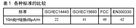 将上面结果列于表1,则从表1可知,若H场是按RFID标准来设计,就可符合EMI的有关标准。