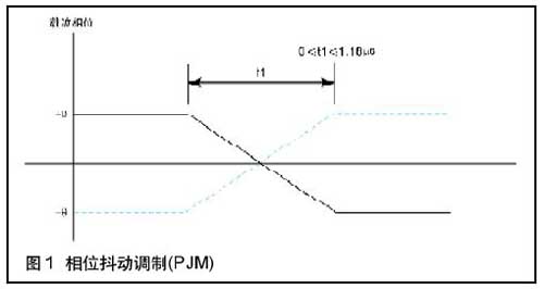 ISO/IEC 18000-3标准中的MODE 2在13.56MHz系统中提出了相位抖动调制(PJM)方法。在读写器向应答器的通信中,利用修正频率编码(MEM)对载波进行PJM调制。通常PSK的二进调制的两个相角是0度和180度,在编码变化时出现了载波相位的跃变。相位的较大跃变使频谱展宽,使功率谱的旁瓣较大,衰减较慢。PJM的两个相位角定义在2度的范围,见图1。因此相位的变化,即抖动减小使信号谱旁瓣较小,且衰减较快。此外,PJM的另一个好处是在读写器向应答器通信中,不会像ASK调制因有停顿而使能量场出现间隙,并且可以支持全双工通信。