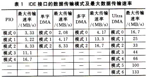 目前,硬盘支持的最为广泛的IDE接口协议中,规定了PIO、DMA以及Ultra DMA三种数据传输模式,其传输速率PIO<多字DMA<Ultra DMA,如表1所列。随着各种多媒体应用的广泛普及,各种设备不但要求拥有海量存储能力,在完成各种实时业务时对数据的传输速率也提出了严格的要求。