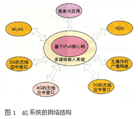 在第四代移动通信系统中,为了满足不同用户对不同业务的需求,将各种针对不同业务的接入系统通过多媒体接入系统连接到基于IP的核心网中,形成一个公共的、灵活的、可扩展的平台,网络的连接如图1所示: