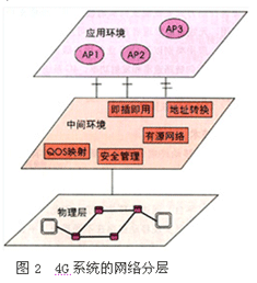 从图2可看出,第四代移动通信系统的网络体系结构可以由下而上分为:物理层、网络业务执行技术层、应用层等3层。物理层提供接入和选路功能,网络业务执行技术层作为桥接层提供QoS映射、地址转换、即插即用、安全管理、有源网络。物理层与网络业务执行技术层提供开放式IP接口。应用层与网络业务执行技术层之间也是开放式接口,用于第三方开发和提供新业务。