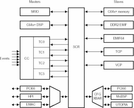 SCR左边的任一主单元均可直接与SCR右边的从单元相连。主单元包括DSP的CPU、串行高速IO (SRIO)、四个传输控制器(TC)以及连接将三个主外设(PCI、HPI与EMAC)的连接至SCR的纵横制端口。从单元包括DSP存储器、DDR存储器接口、Turbo协处理器 (TCP)、Viterbi 协处理器(VCP)以及将多个外设连接至 SCR 的纵横制端口。