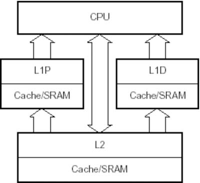 在执行算法时,CPU 与存储器之间的指令和数据传输至关重要。在如图 2 所示的 TMS320C6455 DSP 存储器系统中,可通过使用 256 位宽的数据总线并在 CPU 与存储器之间的内部直接存储器存取 (DMA) 架构上创建两层高速缓存来优化数据传输。