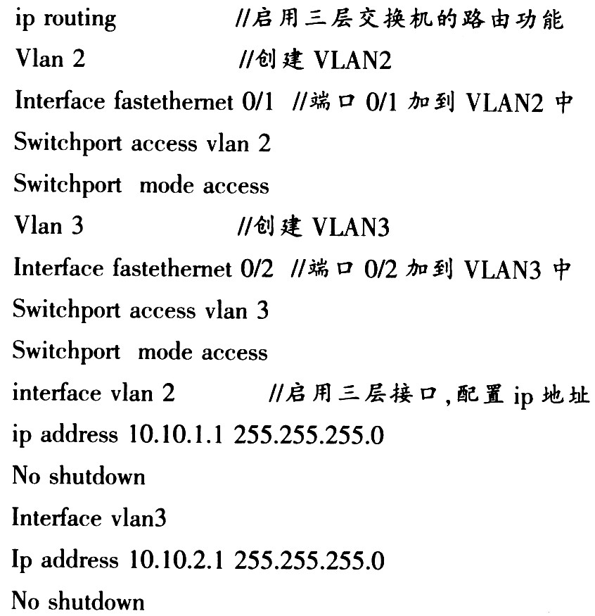 三层交换机,本质上就是带有路由功能的二层交换机。第3层交换机是将第2层交换机和第3层路由器两者的优势有机而智能化地结合,可在各个层次提供线速性能。这种集成化的结构还引进策略管理属性。在一台三层交换机内,分别设置交换机模块和路由器模块;而内置的路由模块与交换模块类似,也使用ASIC硬件处理路由。其具体配置如图2三层交换机实现VLAN间通信拓扑实例所示。