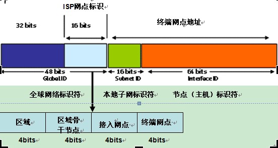 按照上图的原则,终端网点(企业或个人用户,见附录的定义)分配一段/48的IPv6地址,最终连接主机/PDA设备的子网分配1段/64的IPv6地址,假设互联网服务商自己分配到的IPv6地址段是/32,则该服务商有48-32=16位做自己服务网络的网点