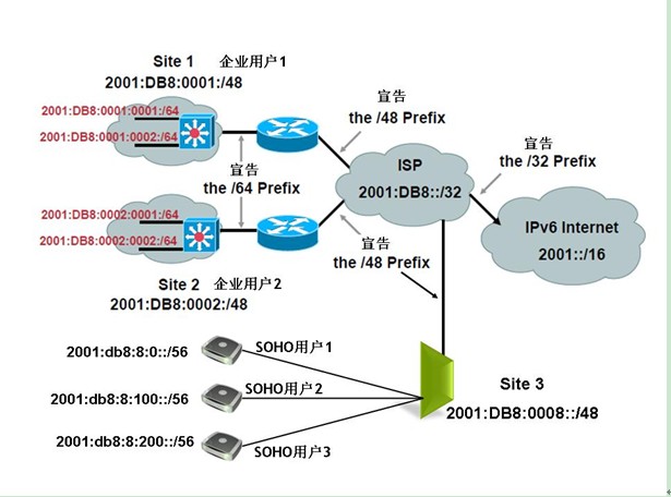 当然,这主要还是根据网络的层次和终端网点的地址分配策略来定,例如,如果上述终端网点分配从/48改为/56,互联网服务商的网点标识就有56-32=24位,每个层级有6位可用,允许64个节点,这样/32就相对足够,同样,如果网络是2-3层结构的话,/32也相对足够。
