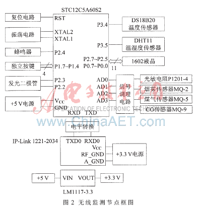 无线监测节点采用“MCU+RF+Sensor”的模式,如图2所示。单片机采用宏晶科技公司生产的STC12C5A60S2,它有两个串口,片内集成60 KB的Flash存储器,1 280 B的数据存储器,1 KB的EEPROM,8路10位高速A/D转换器。无线模块采用Helicomm公司的IP-Link 1221-2034,该模块符合IEEE 802.15.4标准,工作频率是2.4 GHz,属免许可证的ISM频段。STC12C5A60S2与IP-Link1221-2034之间通过串口进行通信,前者的串口属5 V TTL电平,后者的串口是3.3 V TTL电平,两者连接时要进行电平转换。