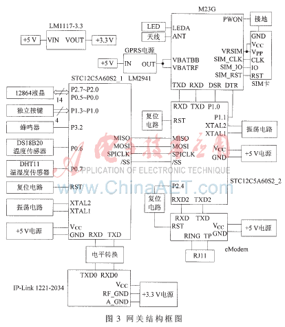 网关主要由两个STC12C5A60S2单片机作为控制器,它们通过互为主从方式的SPI总线连接。STC12C5A60S2_1连接Ad hoc无线模块,通过SPI总线将WSN采集的环境状况数据传输给STC12C5A60S2_2,后者通过串口连接GPRS/GSM模块及嵌入式Modem(Embedded Modem,eModem),以接入GPRS/GSM网络、Internet和PSTN。